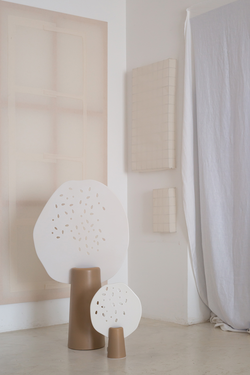 L’ensemble propose une cohabitation de registres plastiques, où la robustesse des volumes utilitaires dialogue avec la légèreté ajourée des éléments décoratifs. Ce dispositif cherche à interroger la perception de la céramique dans son ambivalence structurelle et expressive.