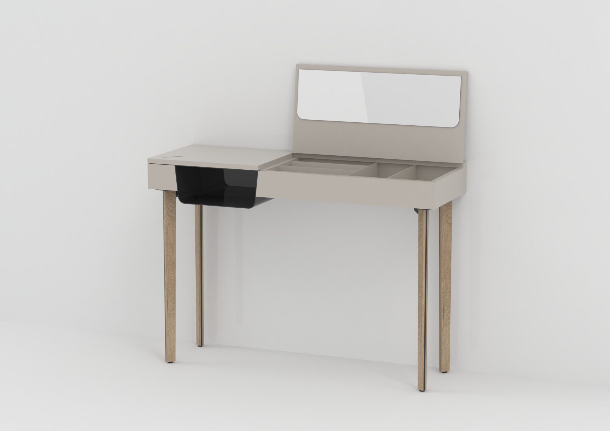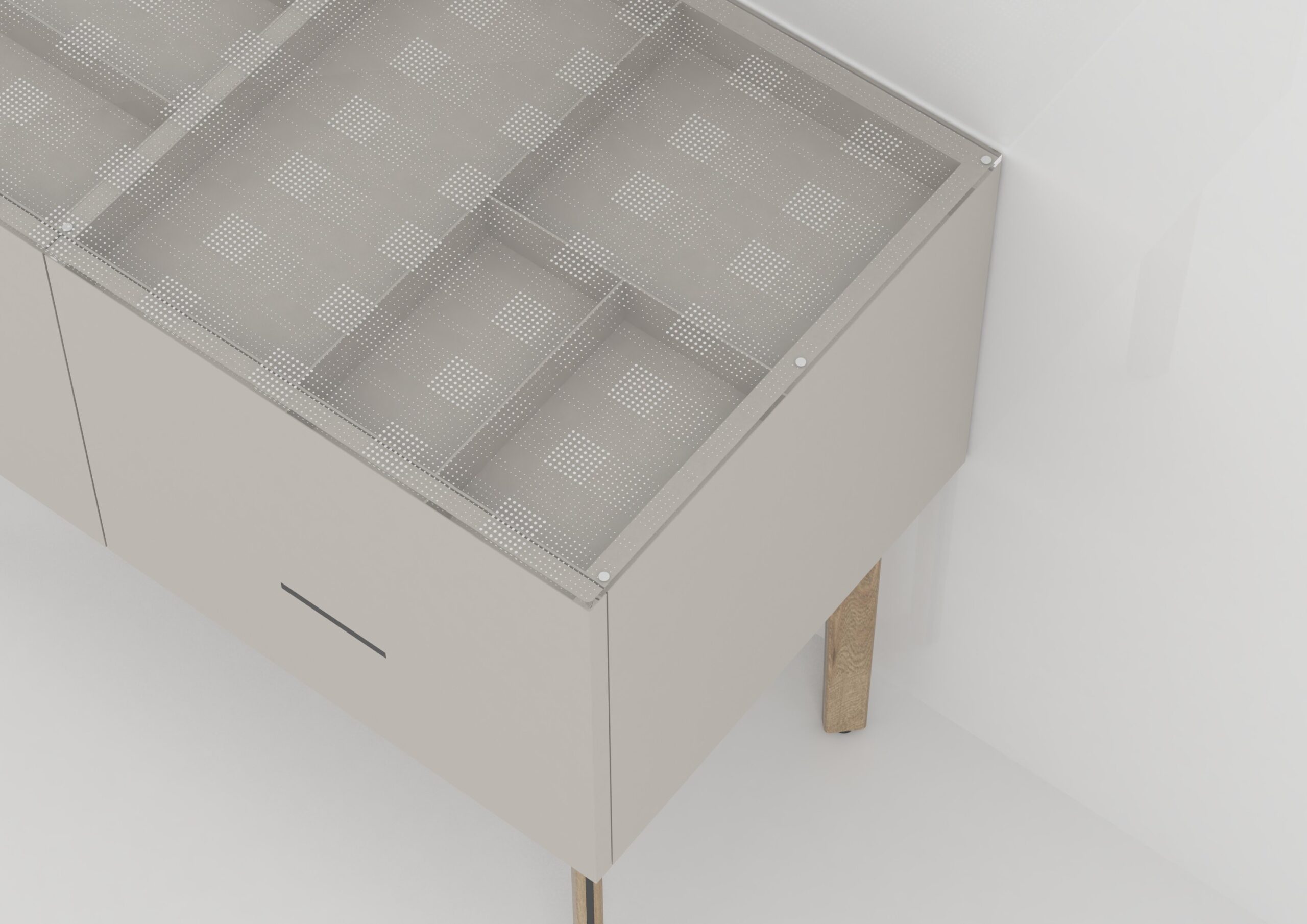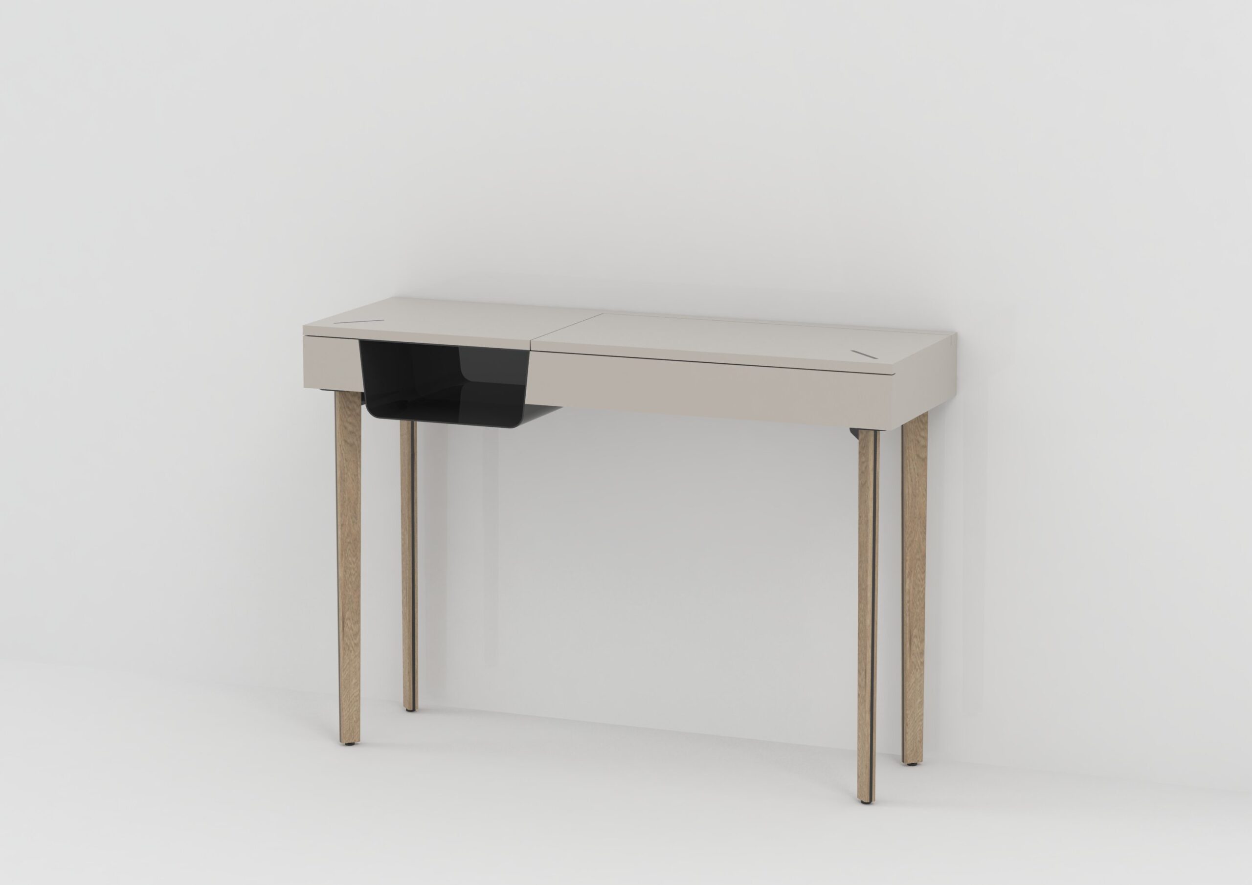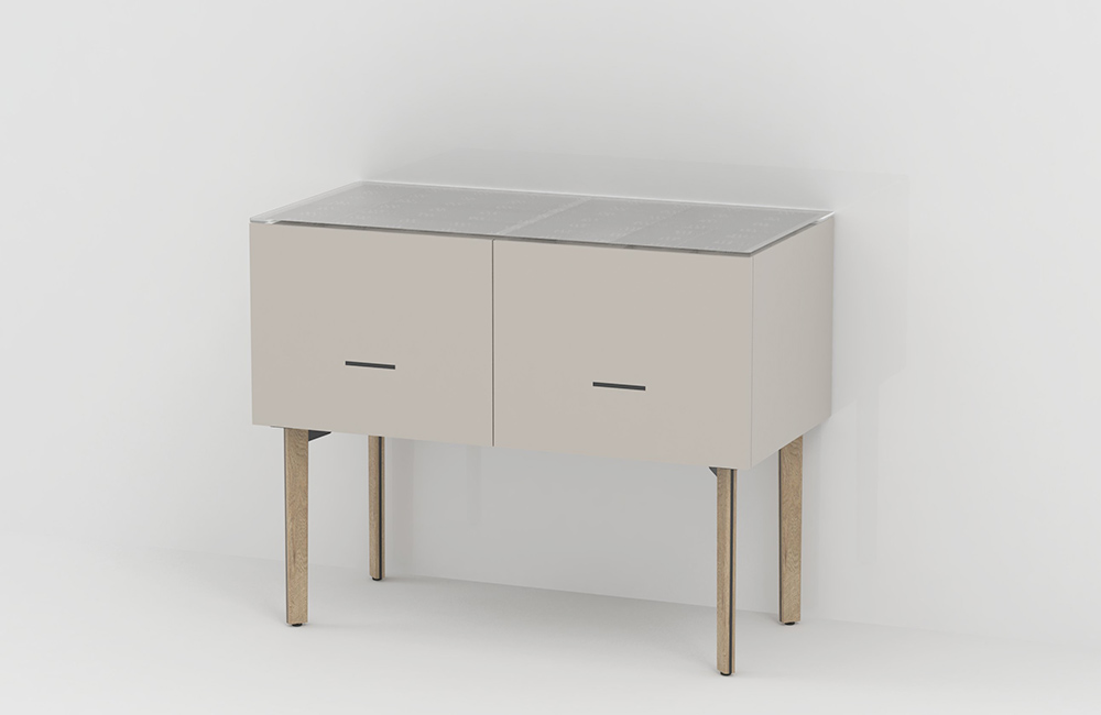 Ces composants ont permis la stabilisation de plusieurs typologies de mobilier, à savoir : une console/secrétaire, un meuble d’angle, une petite commode vitrine et une table basse. Chacun de ces éléments intègre des caractéristiques formelles distinctives, conçues pour devenir des marqueurs identitaires de la marque QUADRO, destinés à enrichir l’expérience de personnalisation en showroom.