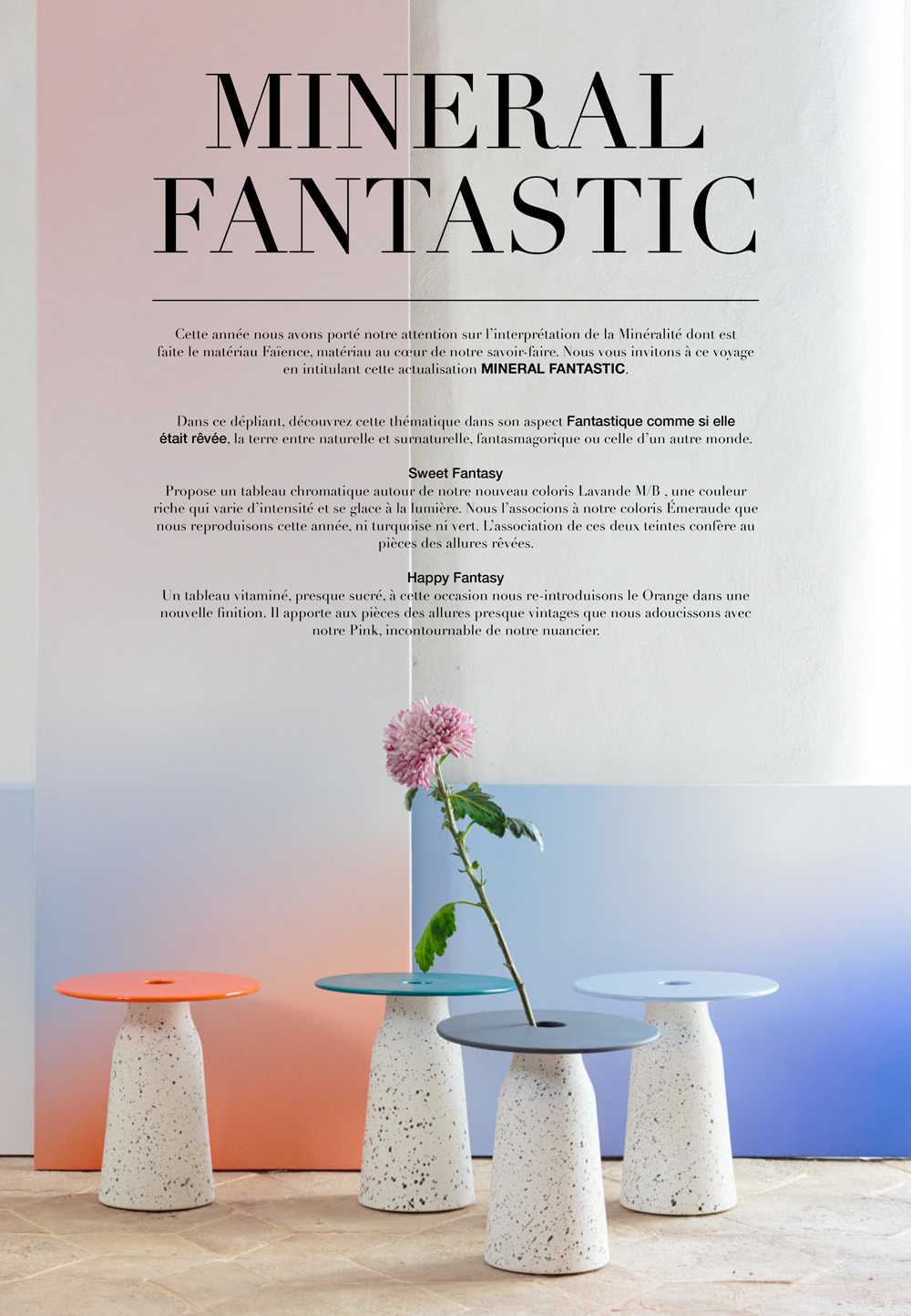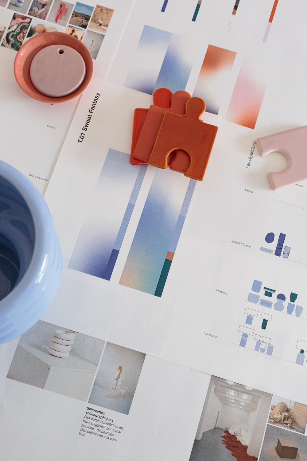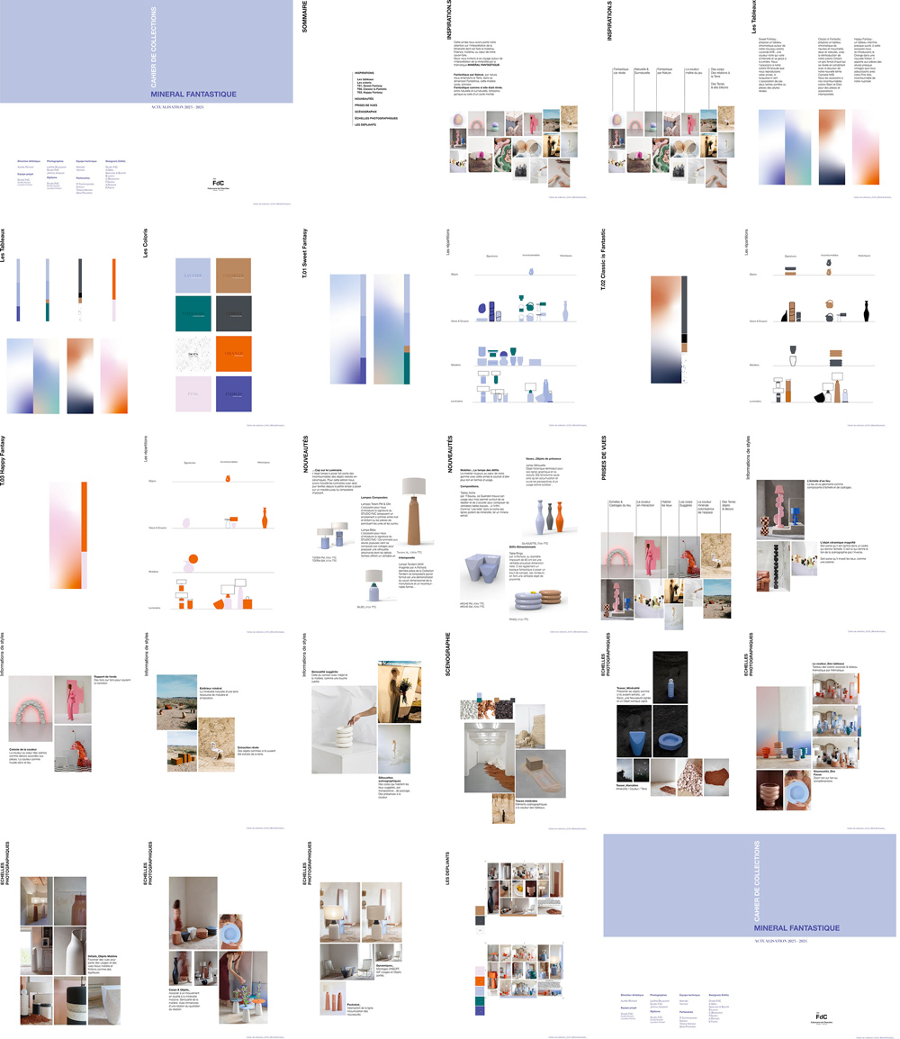 À l’aide d’outils analytiques propres au design — cartographie de l’offre, matrices de segmentation, typologies d’usage — nous avons reconfiguré le catalogue existant en trois chapitres distincts. Cette re-segmentation a permis d’introduire une rotation du nuancier dans une perspective de renouvellement des compositions visuelles, pensées pour inspirer les prescripteurs du secteur (architectes d’intérieur, décorateurs, etc.). Ce processus s’est accompagné de la conception d’outils de médiation commerciale, à destination des équipes terrain, visant à renforcer la lisibilité et la cohérence des offres.