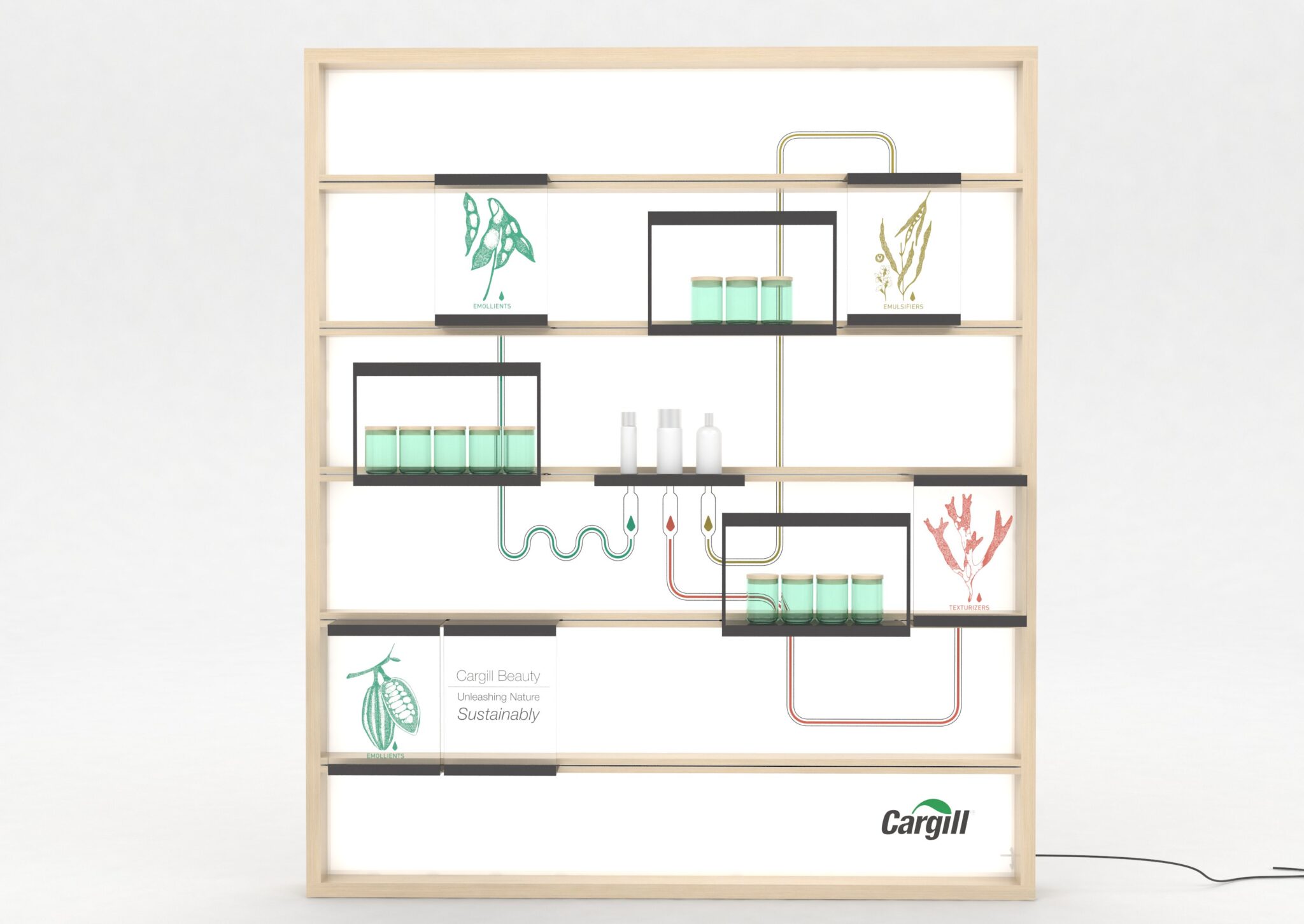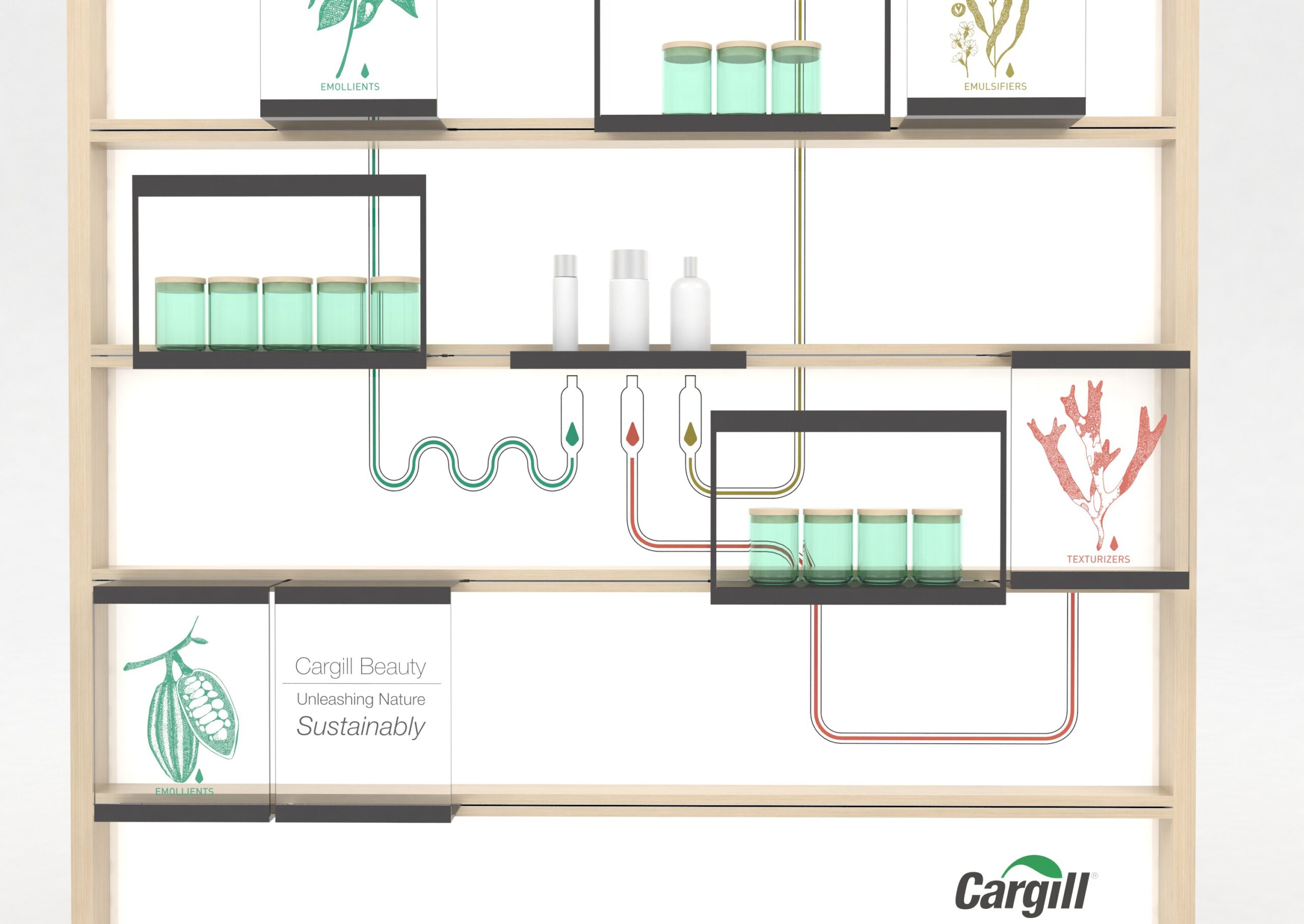 Dans le cadre de cette collaboration, nous avons été sollicités par l’entreprise Cargill Beauty (siège France, quartier de La Défense – Paris) pour concevoir un dispositif pédagogique matérialisant le rôle des composants naturels dans la formulation des cosmétiques.