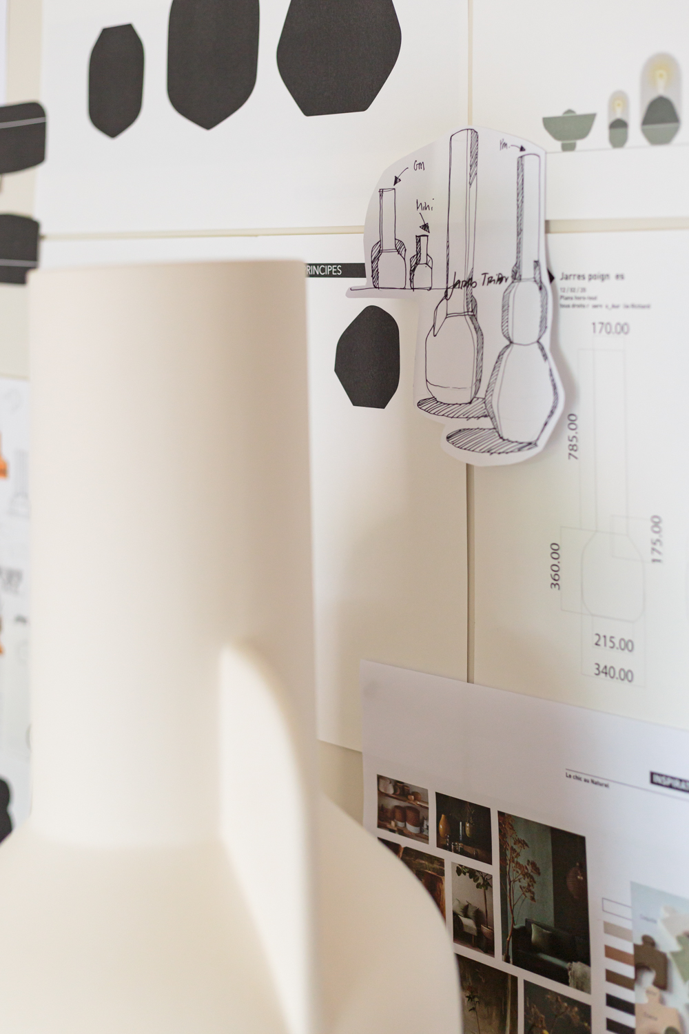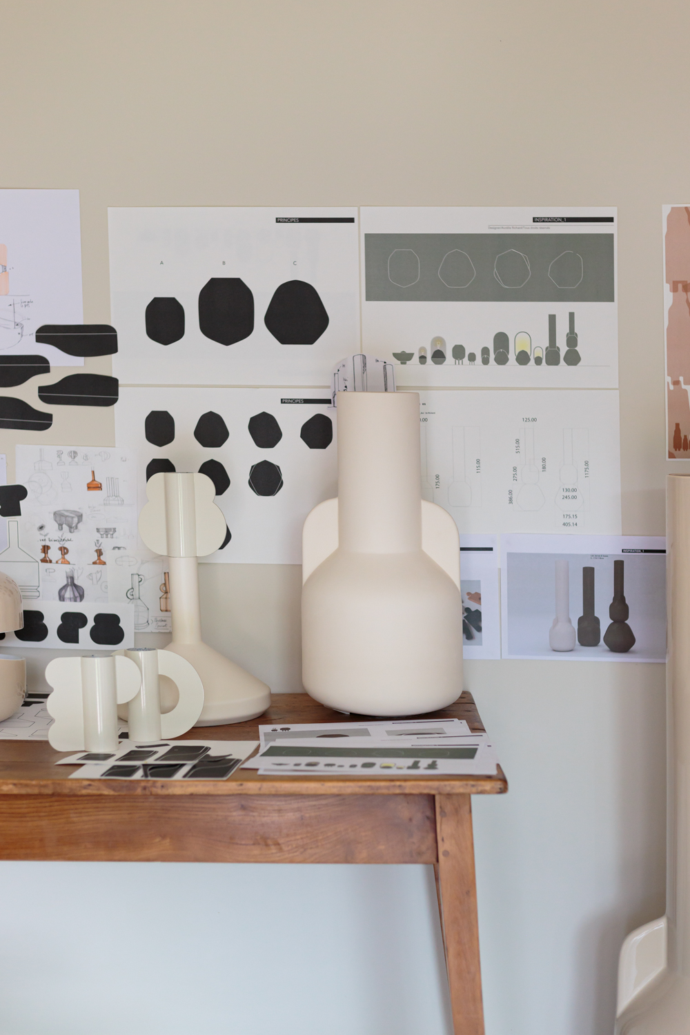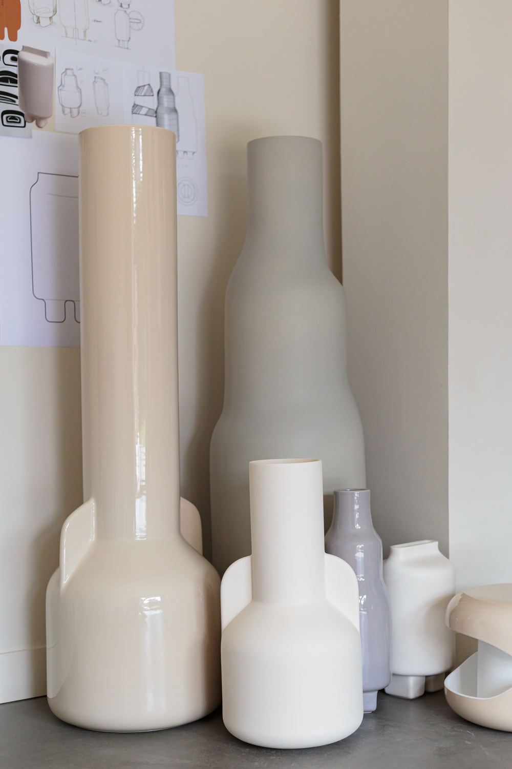 Le trio de vases et la jarre ont été conçus spécifiquement pour une fabrication en faïence, soit par moulage en une seule pièce, soit par assemblage par collage, selon les contraintes techniques propres à chaque forme. Cette attention portée aux modes de production a guidé le développement formel des pièces, dans une logique de cohérence entre procédé de fabrication et intention esthétique.