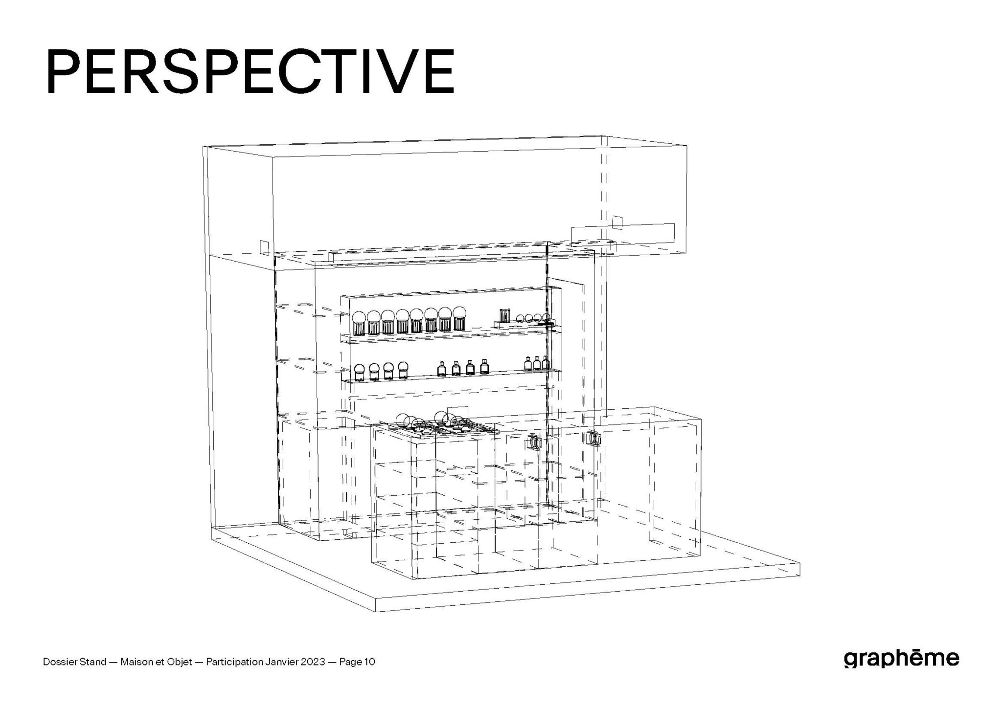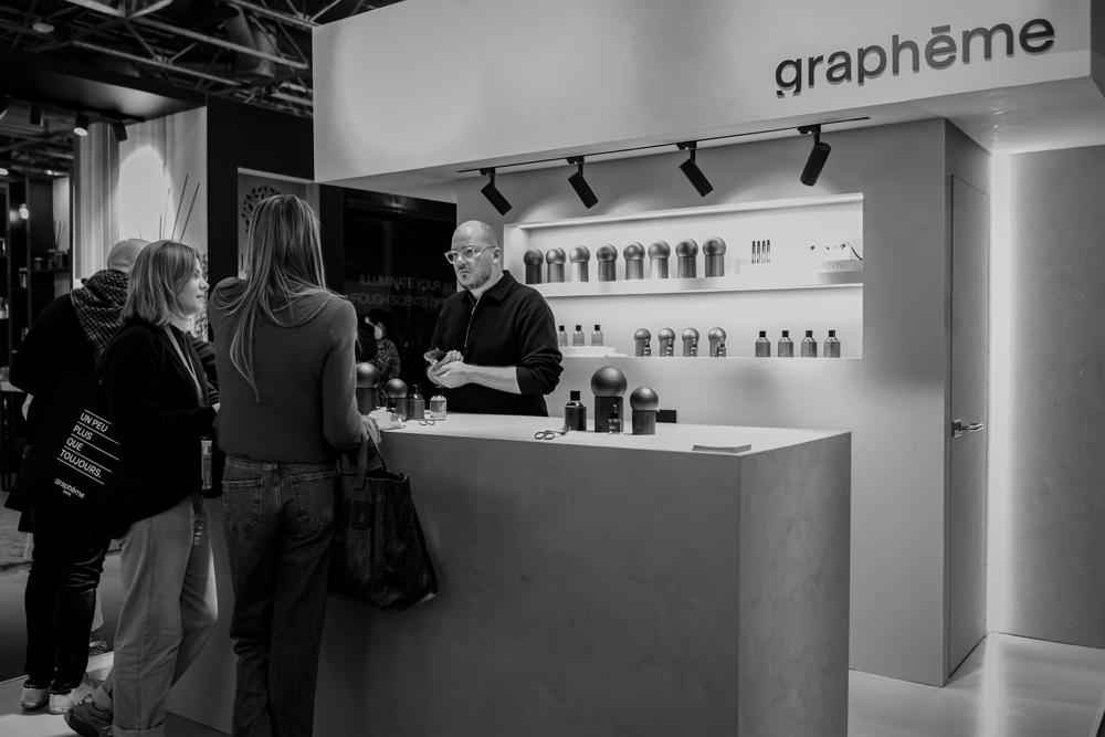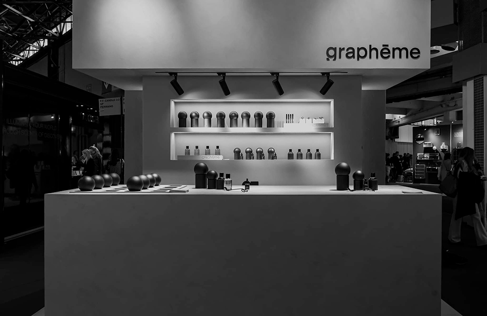 L’ensemble de la scénographie articule matériaux, lignes et volumes de manière à traduire visuellement l’identité de Graphēme, tout en orchestrant une découverte progressive et immersive des fragrances. Ce travail constitue une étape clé dans la formalisation de l’univers de marque, en proposant une lecture à la fois esthétique et expérientielle du projet.