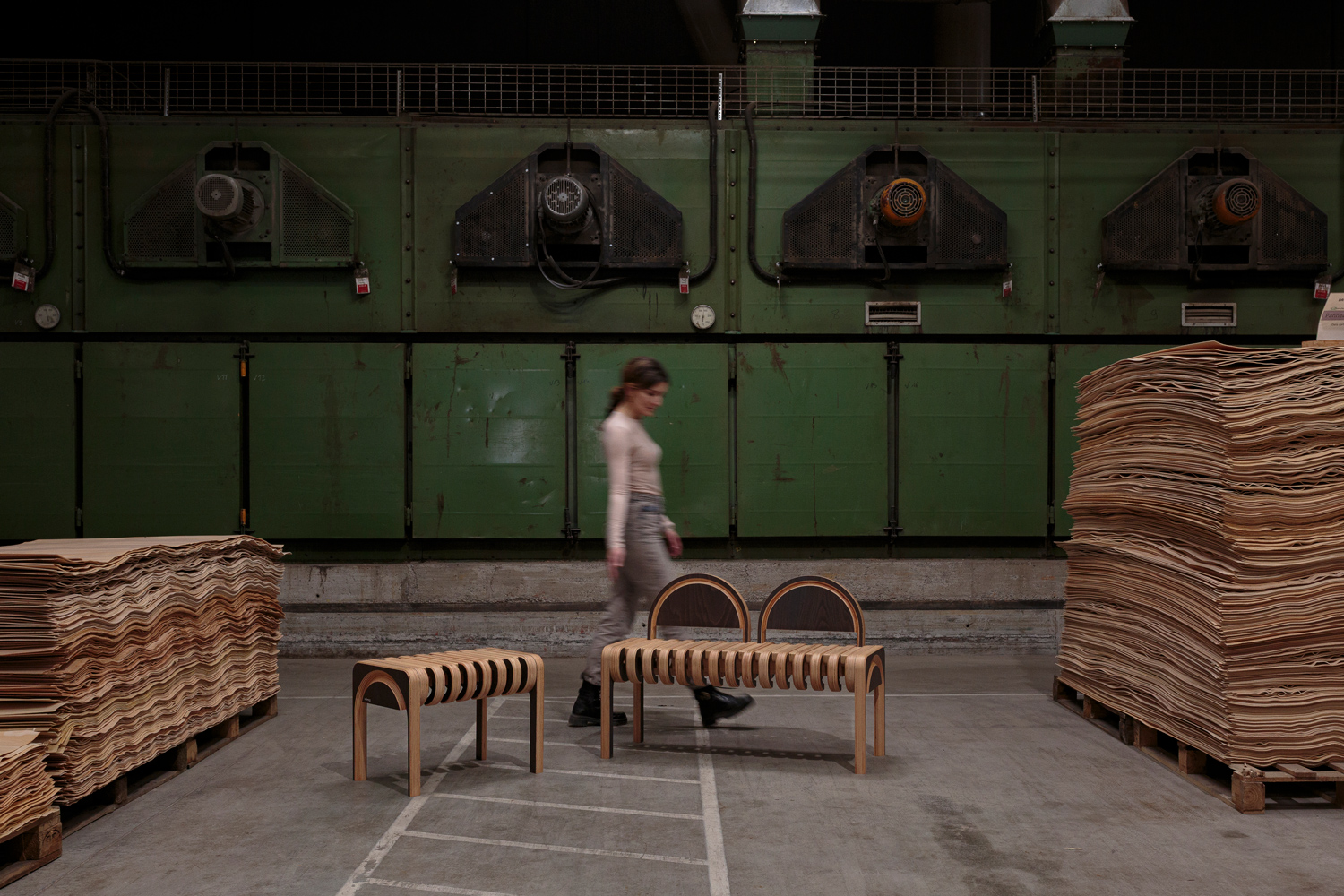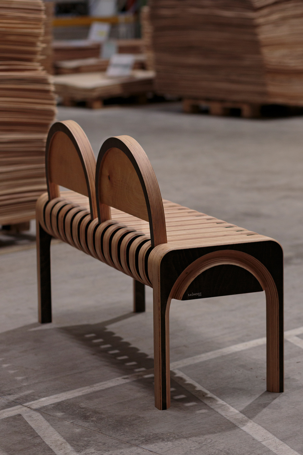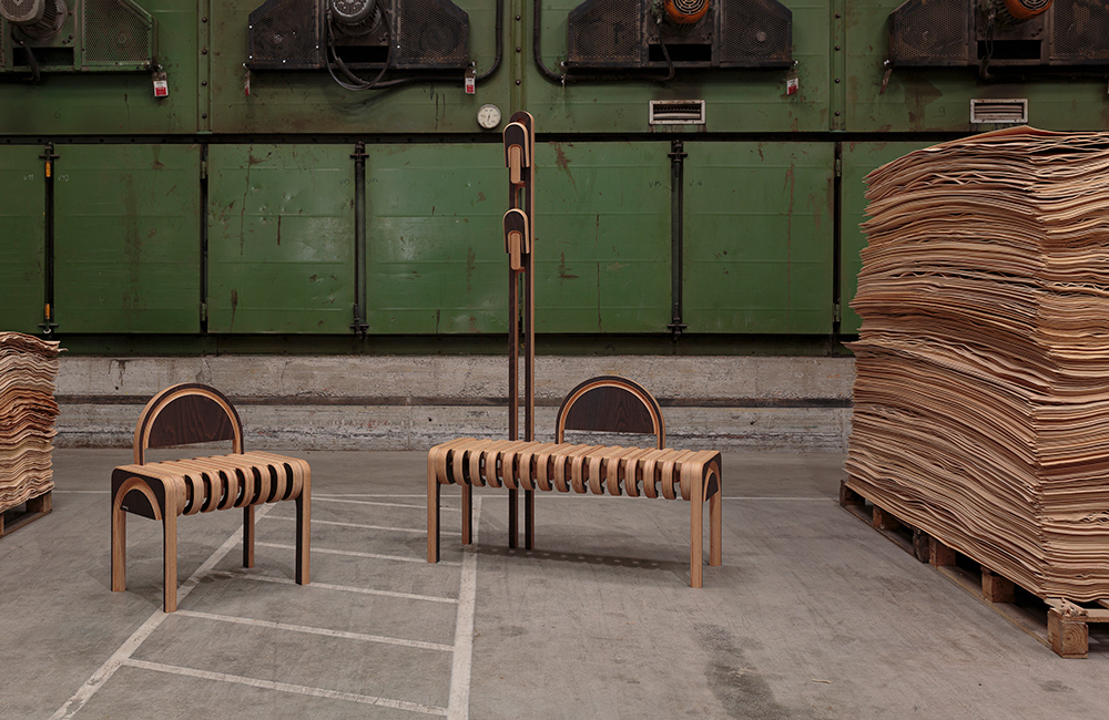 Le banc STRATE constitue la formalisation concrète de cette démarche. Réalisé en multiplis de hêtre, il déploie une structure à strates apparentes, évoquant un corps “mille-feuilles” dont l’épaisseur devient langage visuel. Ce traitement met en valeur le potentiel plastique du multipli, qui se fait matière précieuse grâce à des jeux d’usinage révélant une forme de marqueterie structurelle.