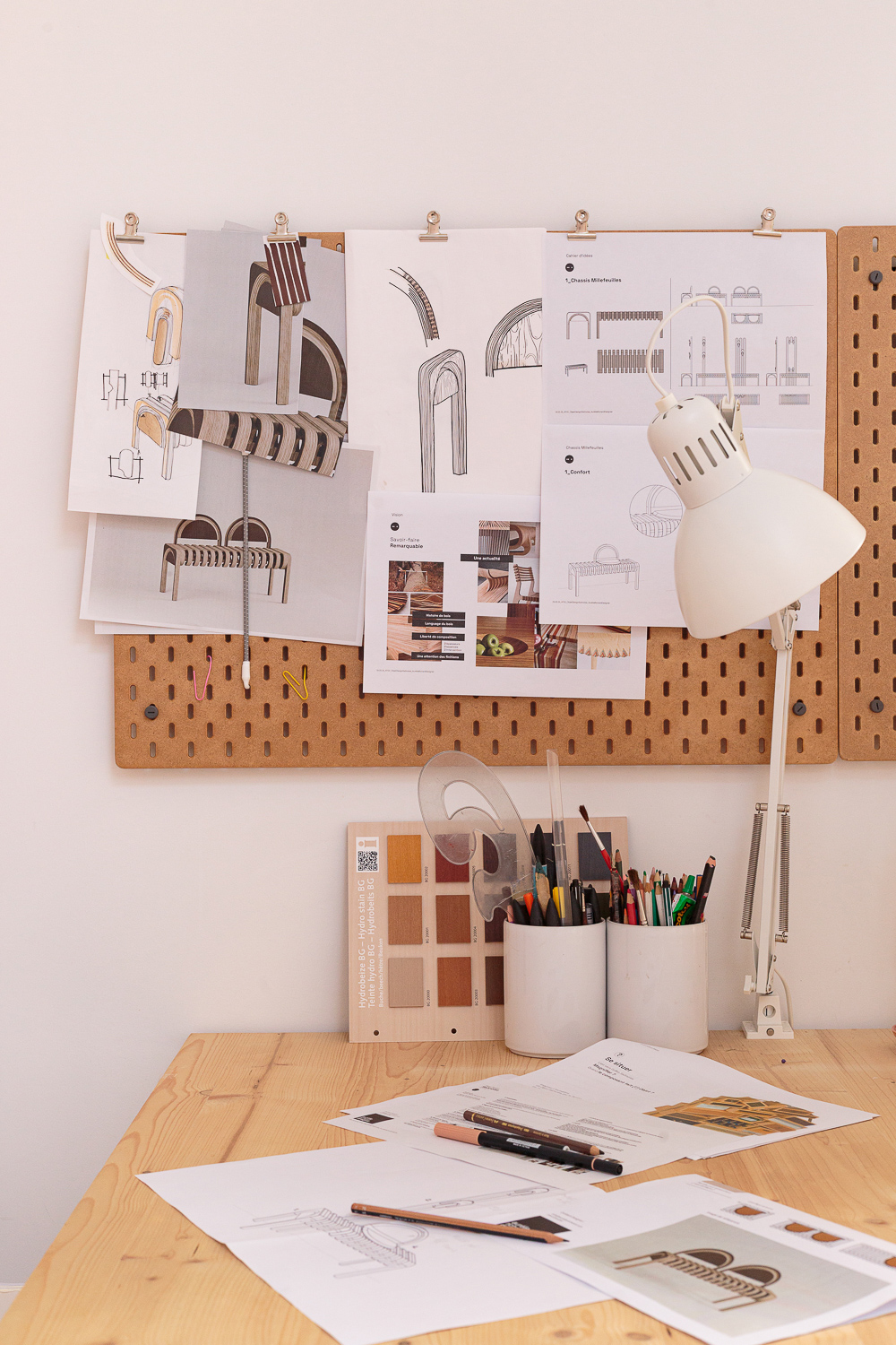 Des composants fonctionnels modulaires viennent enrichir l’assise de différentes situations d’usage (assises complémentaires, patères, éléments de rangement), consolidant la logique d’objet-outil.