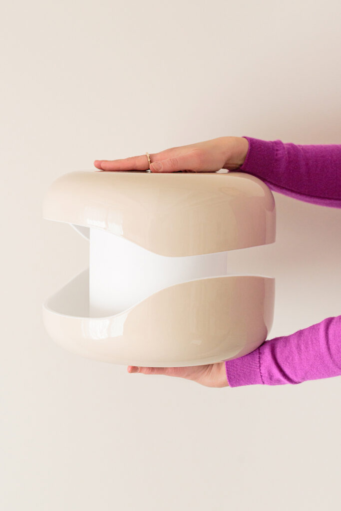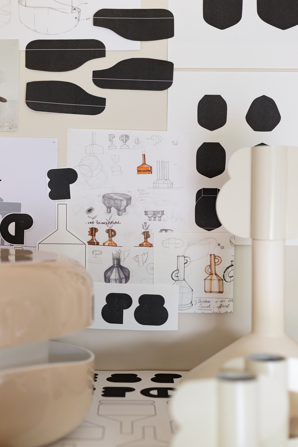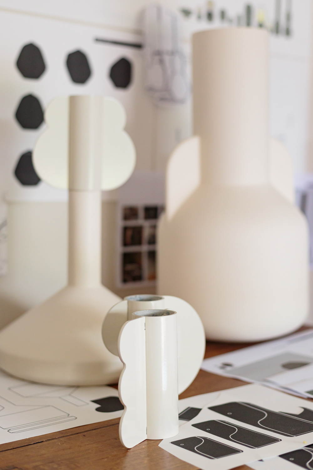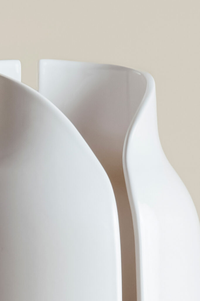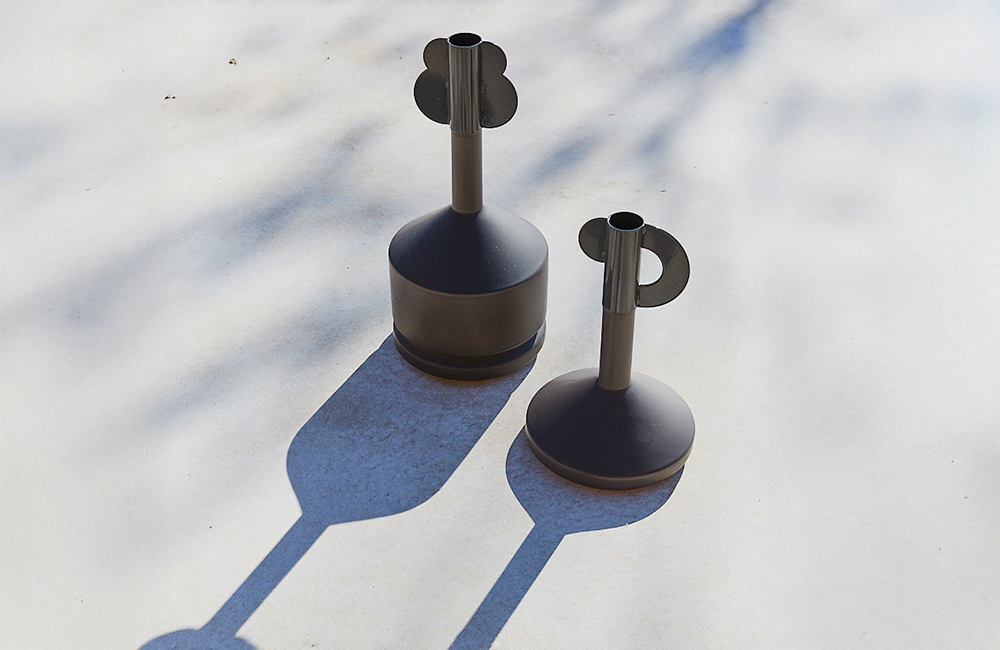 Notre démarche visait à associer un corps creux en céramique à un élément de finition graphique, finement dessiné, venant jouer un rôle de ponctuation visuelle et de hiérarchisation formelle. L’introduction du métal, traité en ton sur ton avec la céramique, crée une continuité chromatique qui renforce l’unité de la silhouette tout en valorisant la dualité des matières.
