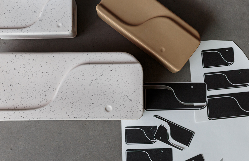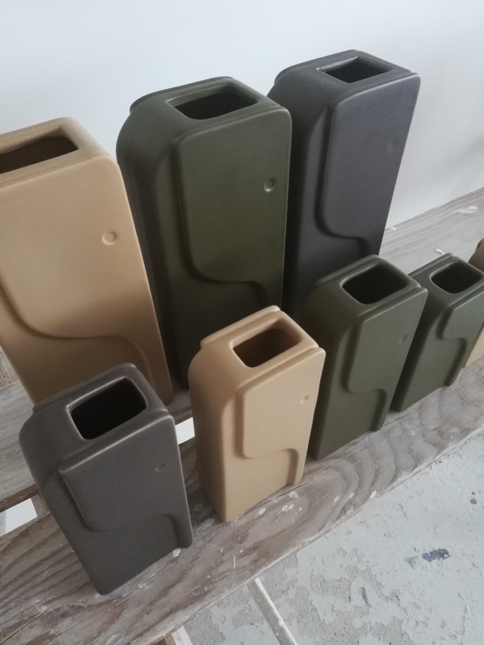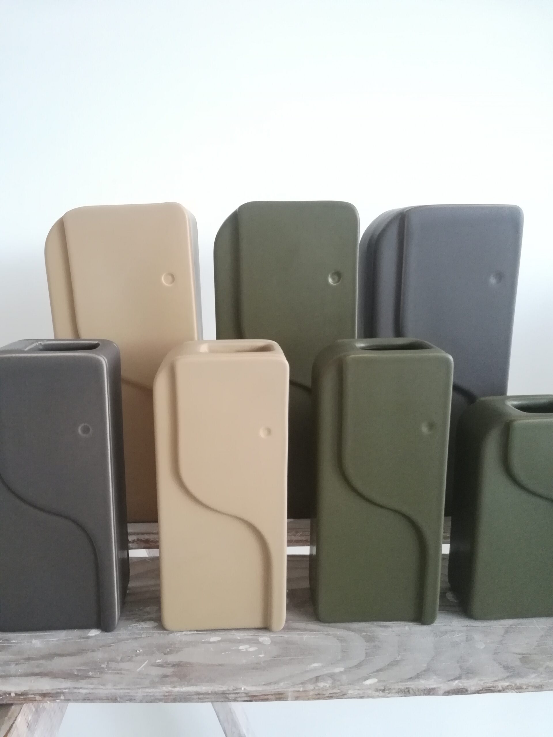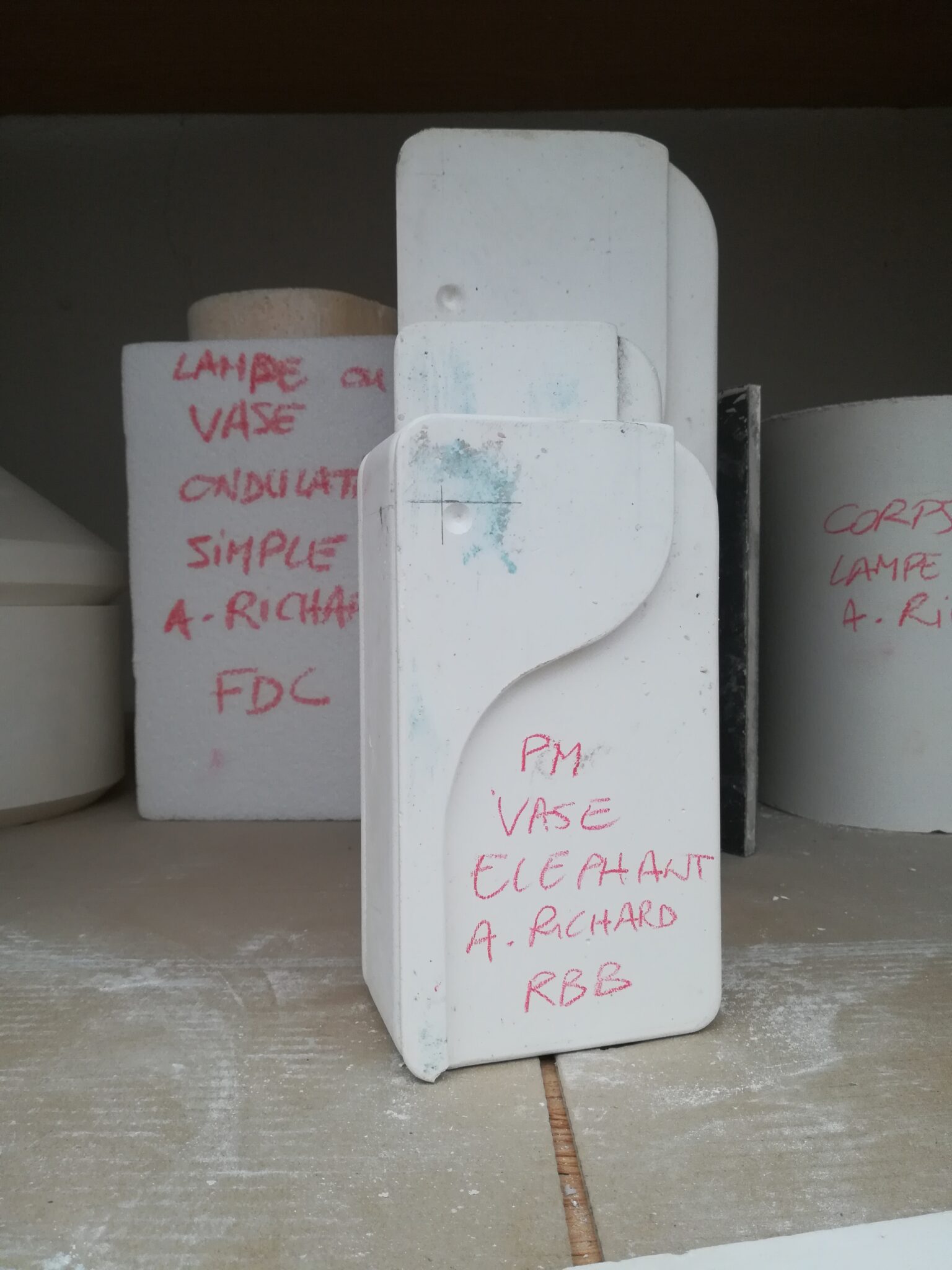 Le trio de vases Éléphant a été conçu pour être réalisé en faïence moulée, explorant la convergence entre forme animale et géométrie fonctionnelle.